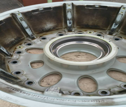 ![]() 需要翻新處理的飛機(jī)輪轂外形尺寸:Φ450-700*H140-400mm (看看,才幾天的飛行,飛機(jī)起降對輪胎、輪轂的沖擊有多大!) 噴砂后接受探傷檢測時(shí)的輪轂,讓損傷一覽無余!